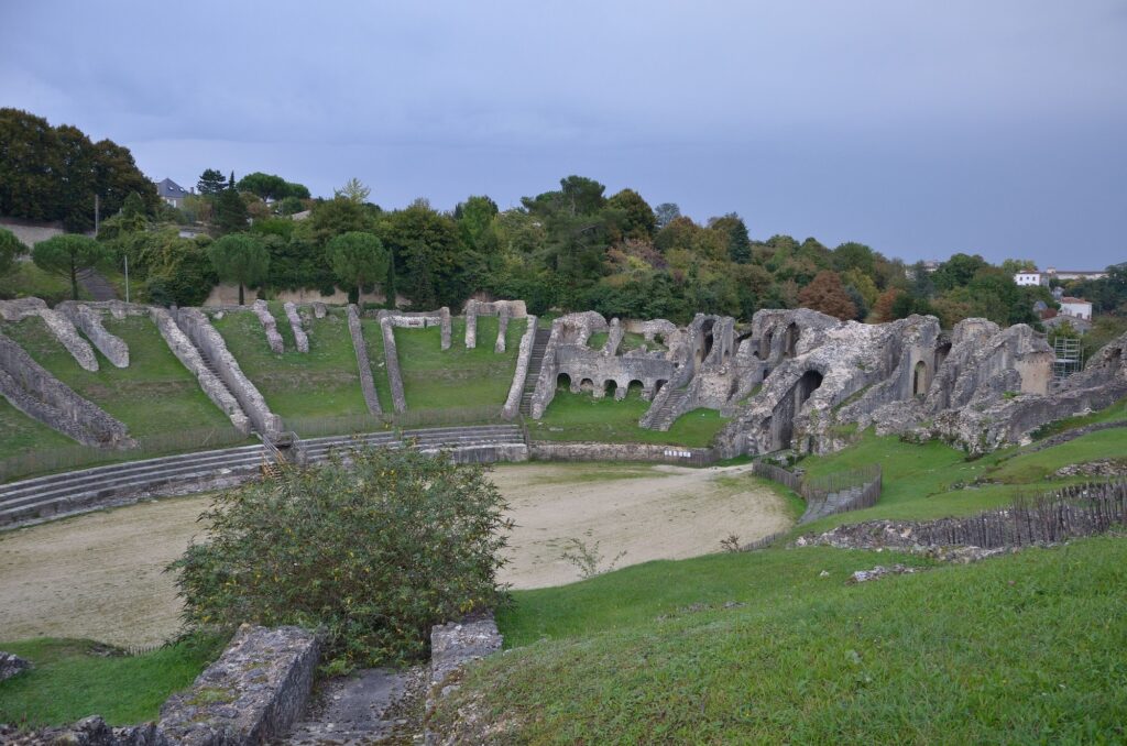 • Saintes.La ville de Saintes, 2 fois millénaire, se pare d’imposants monuments romains (amphithéâtre, arc de Germanicus, thermes de Saint-Saloine). Vers le milieu du IIe siècle, elle compte sans doute entre 10 000 et 20 000 habitants et s’étend sur une superficie de près de 100 hectares76. Près d’un siècle plus tard, invasions et périodes d’anarchie conduisent au repli de la cité dans un castrum ceint par un rempart édifié à l’aide de matériaux issus du démantèlement de plusieurs basiliques et mausolées. N’oublions pas le Cognac, fleuron des eaux de vie françaises